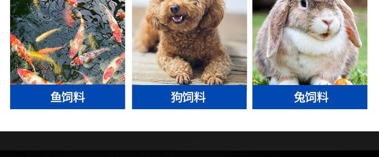 3、顆粒成分均勻,形狀整齊,顆粒粗細(xì)的孔徑可分為:Φ2、Φ2.5、Φ3、Φ3.5、Φ4、Φ5、Φ6、Φ7、Φ8等。用戶訂貨時,可根據(jù)養(yǎng)殖動物不同生長時期需要選擇。